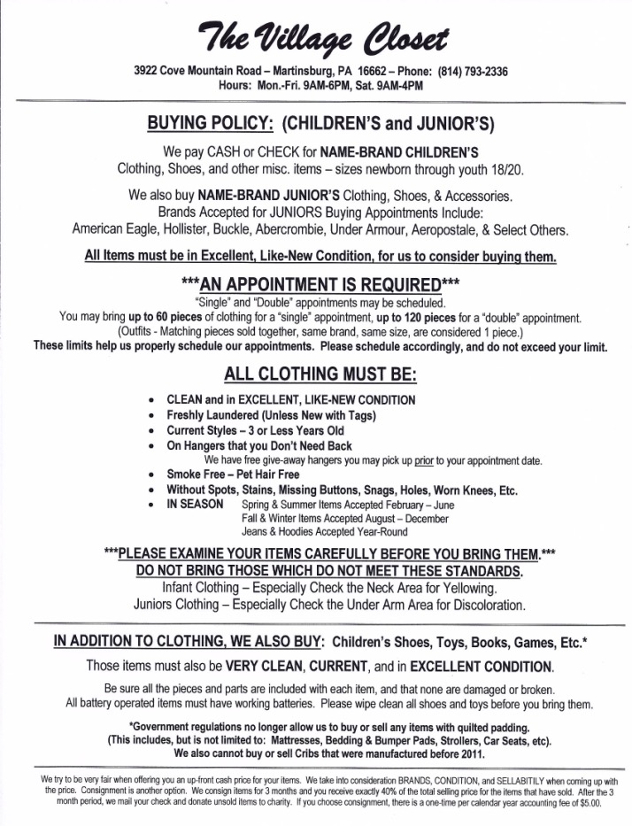 See our consignment policies listed below. Please call (814)793-2048P to set up a “DROP-OFF” day/time.