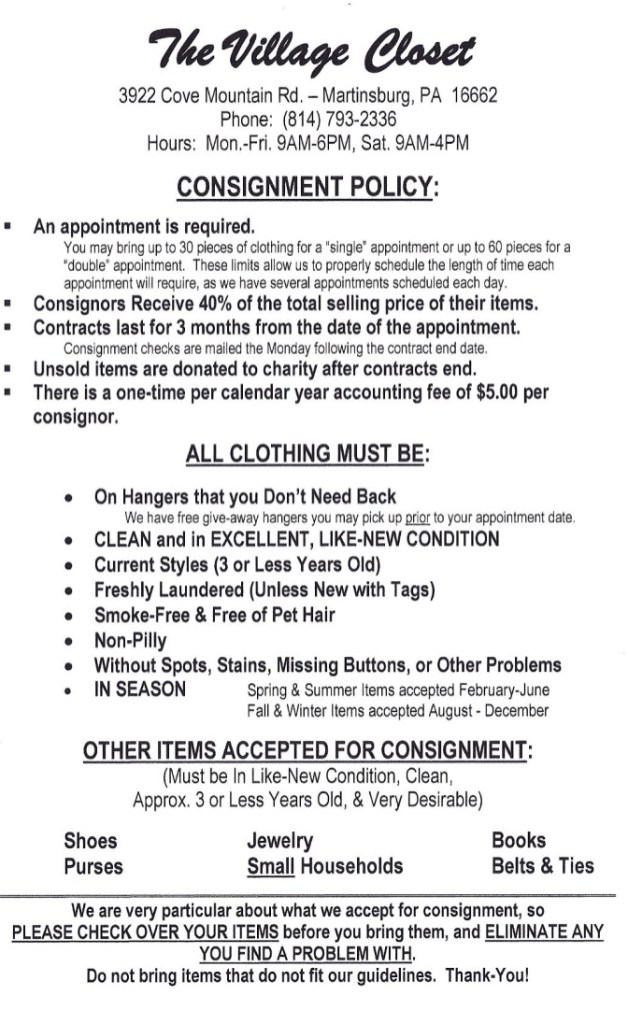 The Village Closet Consignment Shop, nestled between Roaring Spring and Martinsburg, PA, along Rt. 164 in Morrison’s Cove, offers an enjoyable resale shopping experience for the entire family. You’ll find quality clothing and the brand names you love at a fraction of retail prices. We take the time to hand select the best like-new pieces to add to our collection. Your new clothes are awaiting you in our “closet”!